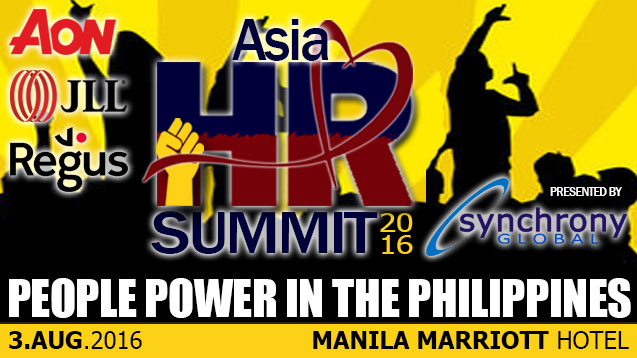 **Asia HR Summit 2016**, presented by **syncHRony Global** with Elite Sponsorship by **Aon**, **JLL** and **Regus**, is all about People Power in the Philippines. The Philippines produces tremendous talent sought after by organizations worldwide. We recognize that focusing on human capital is the driving force that can accelerate business results. By arming the workforce with the necessary training, processes, and technology, we can unlock the secret in achieving year-on-year business growth. Join us on August 3 at the Manila Marriott Hotel (beside Resorts World). The theme is “People Power” * Empowering People with the Right Processes * Equipping People with the Right Technology