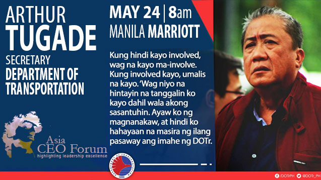 President Dutertes ambitious Build, Build, Build program will modernize the countrys infrastructure backbone with 75 flagship projects spending at least $36 billion. Responsibility for much of these fall on the broad (but overloaded) shoulders of Arthur Tugade, Secretary of Transportation. Six airports, nine railways, three bus rapid transits, 32 roads and bridges, four seaports and many more will help bring down the costs of production, improve rural incomes, encourage countryside investments and create millions of jobs. Hear Art Tugade, describe his progress and incredible challenges managing the largest transportation investments in the history of the nation. If he is successful, Philippines will set the economy on the road of middle-income status as early 2022. Art Tugade is not only one of the most powerful men in the nation, he is also one of the most likable and a fantastic speaker. He is among many in the current administration who are sacrificing their careers (and personal health) to move the nation ahead in the face of incredible opposition and unfair criticism. Art Tugade grew up in the slums and worked his way to being a lawyer and successful business owner. A scholar of San Beda College from Elementary to Law School, Tugade believes in giving back and paying forward. He founded Perrys Group of Companies, with interests in trucking, logistics, shipping, fuel distribution, travel, and fashion. Perrys is a testament to Tugades brand of leadership and his high regard to what he says is every business greatest asset: the employees. Apart from bonuses, the companys employees are entitled to free lunch, monthly grocery allowance, transportation allowance, and free use of amenities such as fitness gym and nursing room. Art started as an Executive Assistant of the Delgado familys Transnational Diversified Group Inc. in 1973 and climbed up the ladder to become President and Chief Operating Officer. In 2012, Tugade was appointed President and Chief Executive Officer of the Clark Development Corporation; a state-owned corporation tasked to manage the Clark Freeport and Clark Special Economic Zone. Under his leadership, CDC reported a record-breaking P1.49 billion ($32.10 million) worth of revenues. The company was winner of the Executive Leadership Team of the Year at Asia CEO Awards. As Secretary of the Department of Transportation, he vowed to fight corruption and institute a sustainable process leading to a modern transport system that will address traffic congestion and provide a consolidated nationwide transportation system.