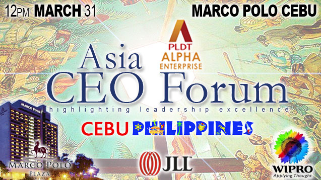**Asia CEO Forum CEBU**, presented by **PLDT ALPHA Enterprise**, with Elite Sponsorship by **JLL**, **Marco Polo Cebu**, and **Wipro BPS** brings together the business elite of the country’s fastest growing economy. Featuring 3 of the nation's most senior business leaders in their industries. **Jonathan de Luzuriaga** (Trustee of IBPAP and President of PSIA) will provide the most up-to-date facts of BPO, Asia's fastest growing sector and what it means for Philippines. **Jibin Arjunan** (Regional Head, Asia Pacific and Japan for Wipro, one of the world's premier BPO companies) will present on his company's outrageous growth plans for Cebu -- and the rest of Philippines. Cebu is the nation's 2nd largest city and its fastest growing economy. Export growth alone has been 20% for the past 5 years. In addition to exploding BPO, retail and real estate sectors, it is home to 80 percent of the country’s inter-island shipping capacity. Cebu is also the most accessible city in the Philippines, with more domestic air and sea linkages than even “Imperial Manila.” CEBU’s peace and order record is one of the strongest and it lies outside earthquake and typhoon zones -- so it is free from major natural disasters. And, fantastic beach resorts are 1-hour drive from where most people work. **Asia CEO Forum CEBU**, presented by **PLDT Alpha Enterprise**, with Elite Sponsorship by **JLL** and **Marco Polo CEBU**, brings together the business elite of the country's fastest growing economy.