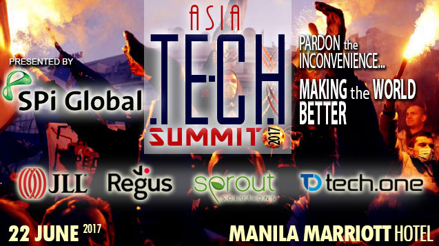 **Asia TECH Summit 2017**, presented by **SPi Global**, with Elite Sponsorship by **JLL**, **Regus**, **Sprout Solutions** and **TechOne Global**. The event features the elite of the industry that is revolutionizing everything it touches – and laying waste to sectors, companies and business concepts that have been in place for centuries. The theme of Asia TECH Summit 2017 is "Pardon the Inconvenience… Making the World Better." +**Jishnu Gupta**, SVP Technology of SPi Global, will tell how he is transforming the nation’s most storied IT-BPO company. +**Peter Murray**, Partner of Delta Capita, intends to show how FinTech will be the end of traditional banking. +**Lars Jeppesen**, CEO of TechOne Global, the regional tech powerhouse, will explain cyber security and the other threats we all face. +**Miguel Cuneta**, of SCI, will finally explain Bitcoin and the outrageous changes that cyber currencies are causing. +**Gian Javelona**, CEO of OrangeApps, was recently recognized in the Forbes 30 Under 30 for his fantastic startup success. +**Frederic Tshidimba**, Founder of ICTjob.ph, will give an indepth look at the critical supply problem for IT skills and what to do. +**Dustin Andaya**, CEO of Island Rose, is called the "King of Roses" and dominates the online flower business in Philippines. +**Magellan Fetalino**, CEO of Acudeen, won a US$500k grand prize for his company’s innovative FinTech solutions. +**Rey Chumacera**, CEO of GHL Systems, runs one of the nation’s largest payment providers. Be with us for **Asia TECH Summit 2017**, presented by **SPi Global**, with Elite Sponsorship by **JLL**, **Regus**, **Sprout Solutions** and **TechOne Global** featuring the nation's most important technology leaders.