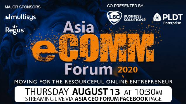 Asia ECOMM Forum 2020 Online on August 13 (10:30am) from the Asia CEO Forum Facebook page. Co-Presented by LBC Business Solutions and PLDT Enterprise. Major Sponsors are Multisys Technologies and Regus | Spaces.